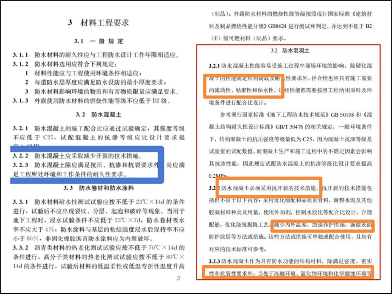 強(qiáng)條對(duì)防水混凝土提出了更高的要求,明確指出防水混凝土必須減少混凝土開(kāi)裂的措施。對(duì)混凝土的和易性(流動(dòng)性,黏聚性、保水性)都做了說(shuō)明。因?yàn)楹芎?jiǎn)單,防水要達(dá)到50年甚至是100年,光靠2道外防水根本做不到,必須依靠混凝土本身,影響混凝土耐久性主要因素就是混凝土開(kāi)裂和混凝土不密實(shí)(蜂窩、孔洞、麻面)這些問(wèn)題的出現(xiàn)也主要是因?yàn)榛炷梁鸵仔圆缓枚斐伞?