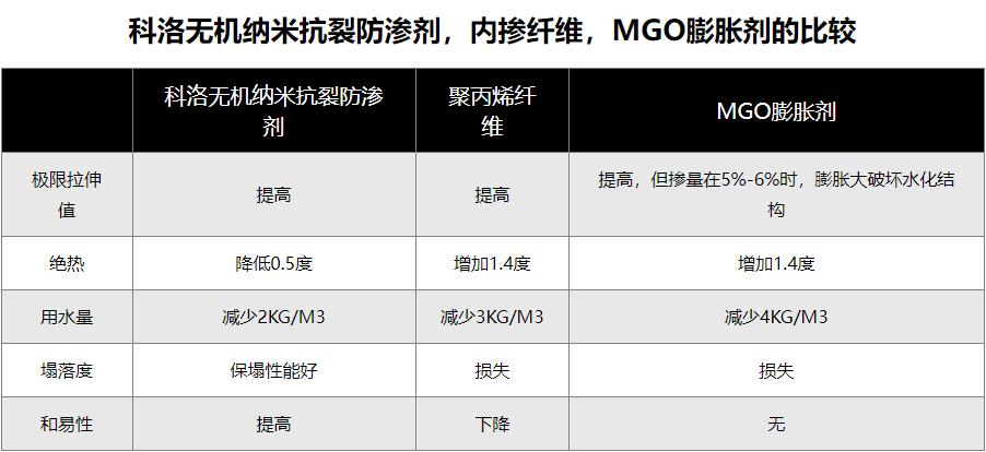 通過大量的工程實(shí)踐,摻膨脹劑的混凝土后期開裂更加嚴(yán)重,摻纖維雖然在一定程度上提供了混凝土的抗開裂能力,但是影響了和易性。摻科洛無(wú)機(jī)納米抗裂劑后,在不影響和易性的基礎(chǔ)上,提高抗開裂能力,同時(shí)可省去泵送劑,并有很好的保塌落功能,2小時(shí)內(nèi)塌落度損失不超過2CM。