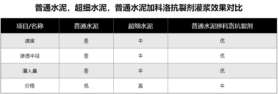 ?普通水泥價(jià)格最低,但難以滿足施工要求。普通水泥摻入科洛無(wú)機(jī)納米抗裂防滲劑后,比普通水泥成本提高50%,比超細(xì)水泥低50%,且效果最好。超細(xì)水泥成本最高,比普通水泥高67%,比科洛內(nèi)摻高33%,且灌漿效果不好。
